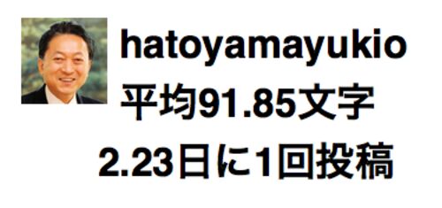人によって発言頻度に差がありそうだったので,表示してみた. 知らない人を見たときに,その人がどのくらいしゃべってるか一目で分かれば,「たくさんしゃべっててうざそうだからfollowやめとこう」みたいな基準になって,便利なはず. 以前作ったスクリプ…