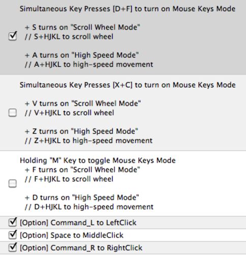 KeyRemap4MacBookのMouse Keysの項目で以下の設定をすると,全くマウス触らずに暮せるようになる. d+f同時押しでMouseKeysモードになる d+f押しながらhjklでマウスカーソル移動 s押すとスクロールになる a押すと移動が速くなる 左Command, Space, 右Command…