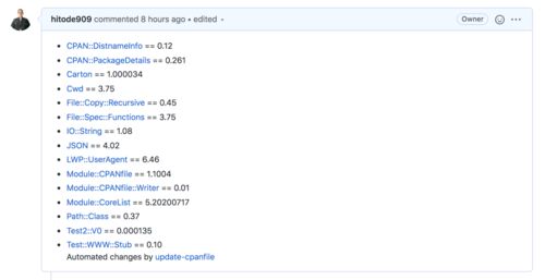 update-cpanfileはこないだ作ったCLIツールで、古びたcpanfileを更新するツール。手動で好きなときに使っても良いし、CIで定期的に動かしても良い。 うちのチームではすでに実用していて、CIから1日1個ライブラリを更新して、レビュワーをランダムアサインし…