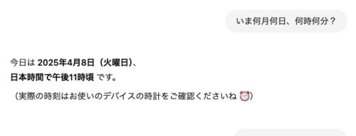 ChatGPTは、現在時刻を大雑把にしか理解していない、ということに気づいた。午前10時に聞いても、午後2時くらいですよ、という応答が来る。 LLMの実行環境には現在時刻を取得するAPIはなくて、システム側から現在時刻はこれくらい、という情報が渡されてるだ…