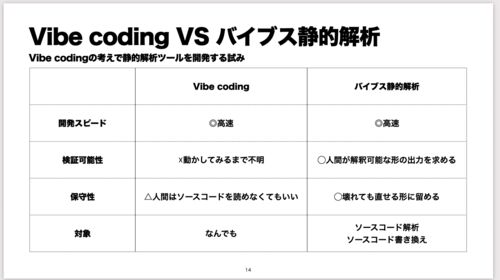 8月くらいに、コードベースから、使ってないコードを探すツールをAIに作ってもらっていたら、突然「バイブス静的解析」という言葉が降ってきて、これだ!とプロポーザルを出したら採択してもらえたので、喋ってきた。 スライド3枚くらいでダイジェストすると…