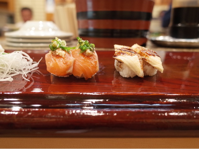 2014-07-13 寿司 寺町の寿司屋.前は通りつつも中の様子を伺えなくて躊躇してたけど,昨日おいしいって聞いたから行ってみた.日曜だけ昼からやってるようだった.カウンターがU字になってて牛丼屋みたいなスタイル.注文すると握ってくれる.穴子おいしかった.生ビールもあって,昼からいい感じに飲めてよかったけど,なぜか6700円くらいした.鱧落とし値段書いてなかったので,それが高かった気がする.また行きたい.