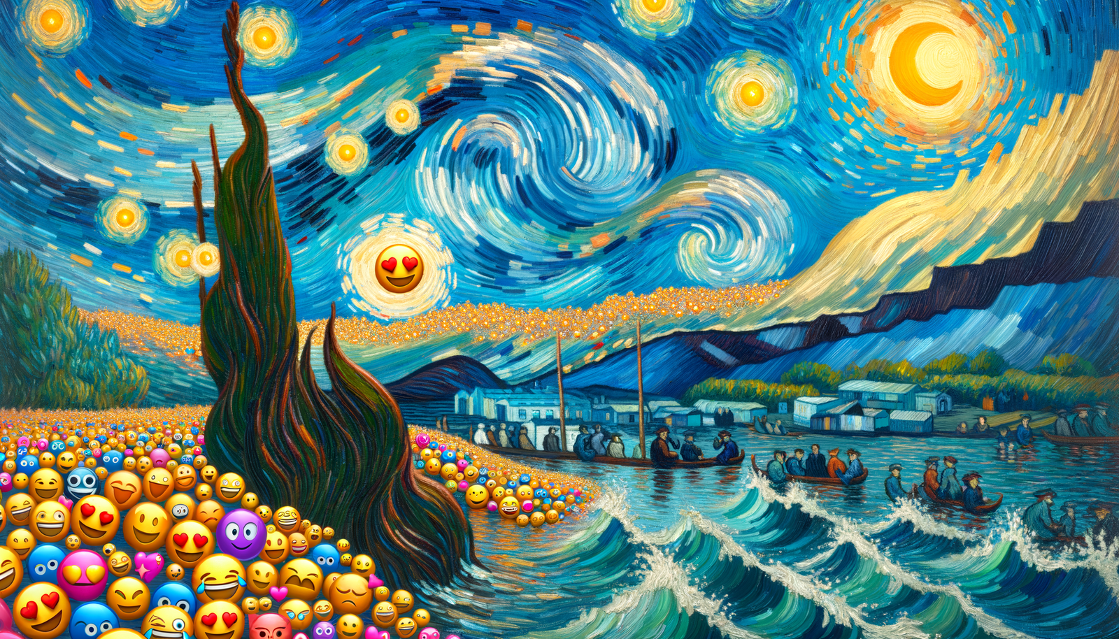 AIが考えた、この絵のお題は"Wireless Totem"/ A collage of tribal masks from global cultures, interwoven with symbols of modern technology (like Wi-Fi signals and emojis), painted in the rich, cubist style of Pablo Picasso。で、画像生成AIによる説明は、Wireless Totem: A collage of diverse tribal masks from global cultures, interwoven with symbols of modern technology such as Wi-Fi signals and emojis. The painting captures the complexity in overlapping geometric shapes, vibrant colors and unconventional viewpoints typical of pre-1912 cubism, the primary medium being oil painting.、とのこと。