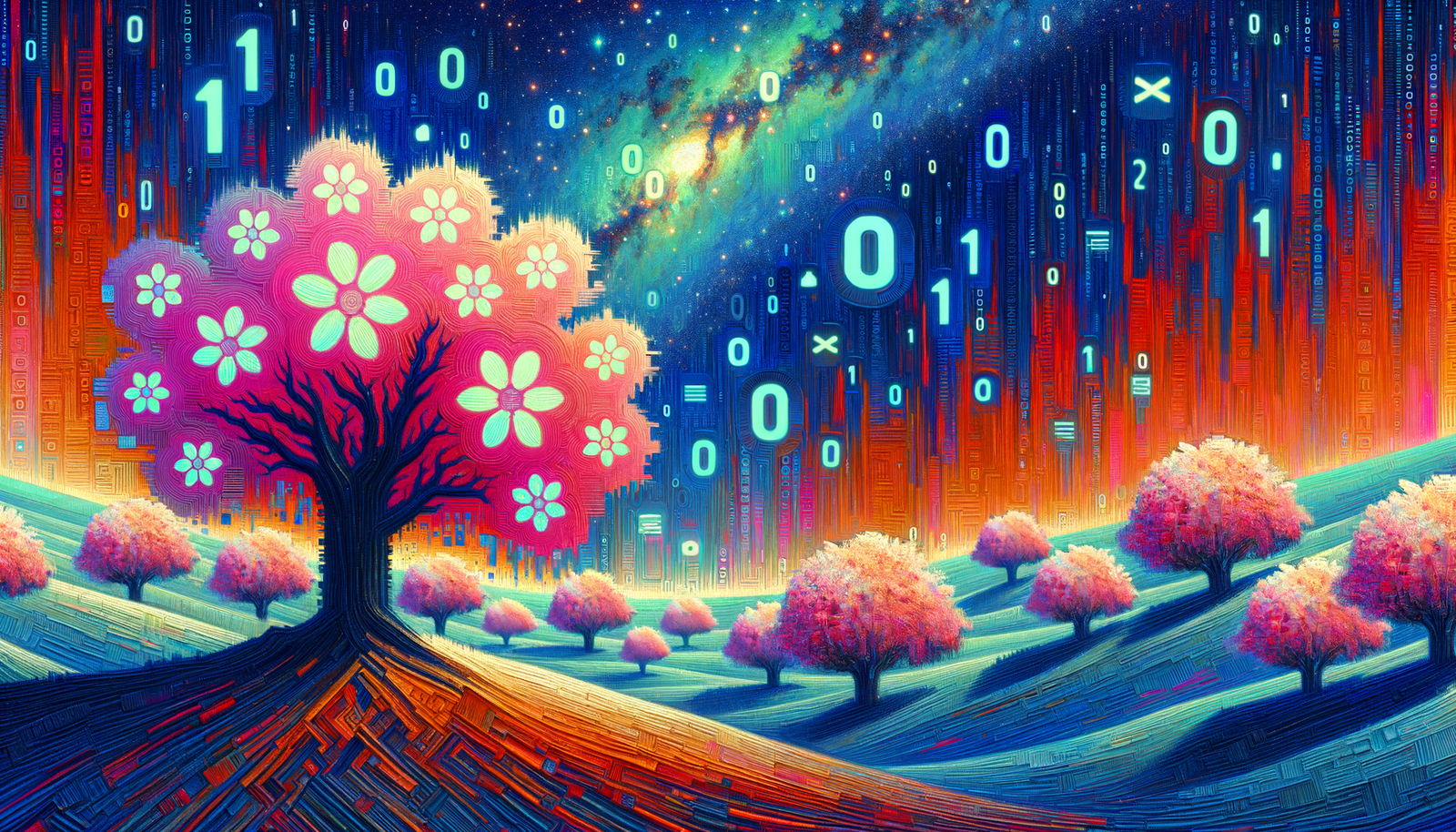 これはBinary Blossoms under a Neon Sky。普通に生きててBinary Blossoms under a Neon Skyを書こうと思っても恥ずかしくて完成させられないと思うのだけど、堂々と作ってくれるのがすごい。生成された瞬間、ダサっって口に出してしまった。